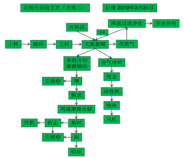 使用正極片處理技術工藝方案二的優點是極片經過無氧裂解,降低了高速摩擦投入,這種工藝簡單生產成本低,可燃氣回用。得到純度和回收率較高正極粉和鋁粒。缺點則是直接裂解塑膜利用值降低,并增加裂解爐的投入。